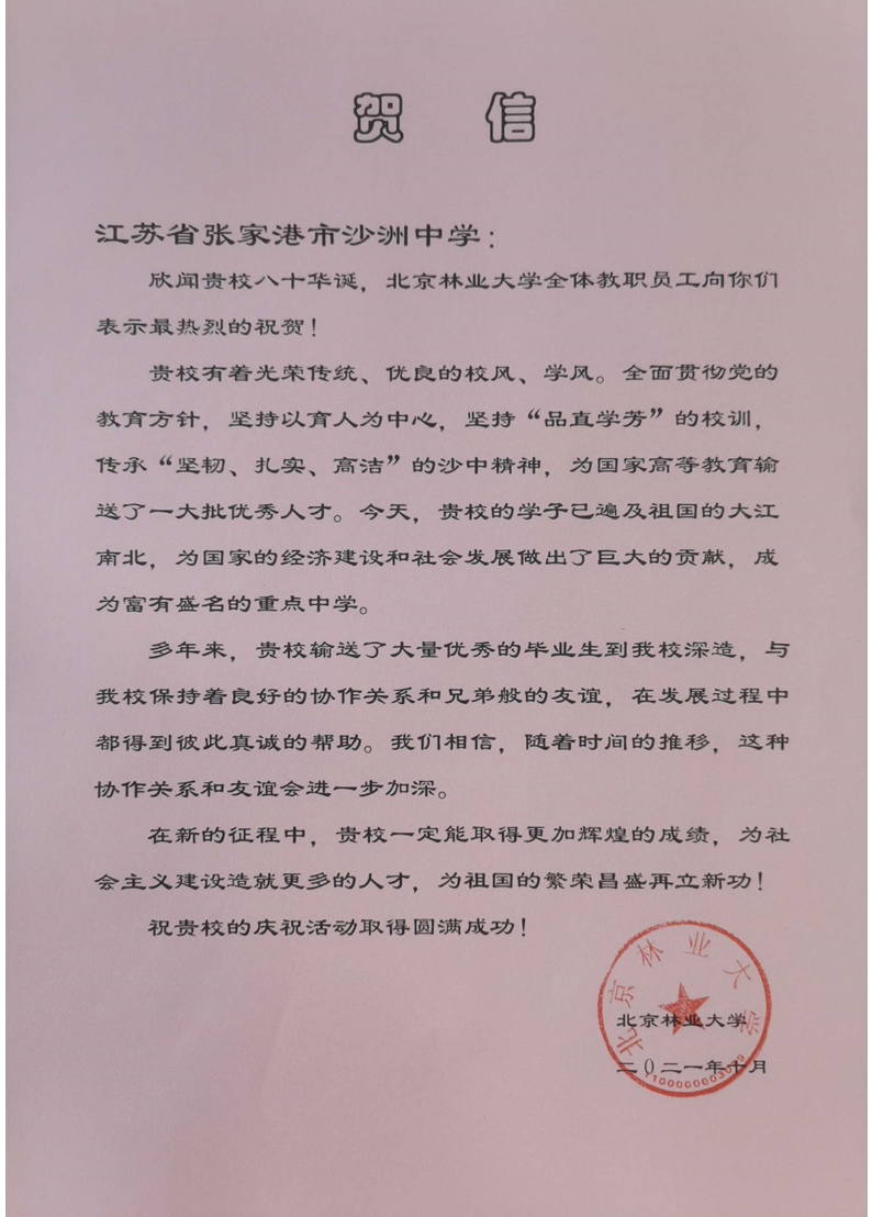 建校80周年北京林业大学贺信